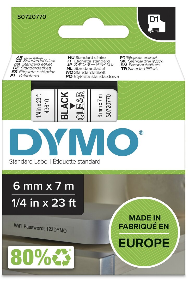 Dymo D1 Zwart op Transparant 43610 breedte 6mm X 7m Vanaf 10 stuks ဠ11.06